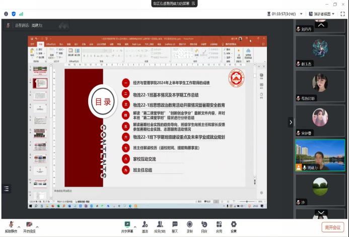 各班级采用腾讯会议的形式开展,会前学工办统一班会模板,各班班主任结合专业年级和班级情况认真制作PPT课件和讲稿。班主任、副班主任、学业导师、“三进两联一交友”结对教师提前进入线上会议做好相关准备。待各位同学、家长进入线上会议室后,班主任亲自考勤,确保本次会议高质量开展。联谊会伊始,班主任对学生及家长的到来表示热烈欢迎,对家长们配合学院安排,合力共助成长的莅临表示感谢,对本次参加会议的老师和会议议程进行了介绍(1.2024年上半年学生工作取得的成绩2.介绍班级上学期基本情况3.介绍班级思想政治教育活动开展情况4.介绍“第二课堂学时”和“创新创业学分”对毕业的影响5.督促2024年暑期社会实践务实开展6.班级展望7.解读校历8.家校互动交流9.班主任总结);班会正式开始,各班班主任重点围绕班级基本情况和暑期安全教育进行解读,从课程学习、考勤(上课+晚自习)、学科竞赛、奖助学金评选、入党入团、参与校园文化活动6个方面对班级本学年的工作进行总结,认真结合成绩单,参照每名学生的在校现实状态,直面学生各类问题,剖析成绩背后的行为逻辑。